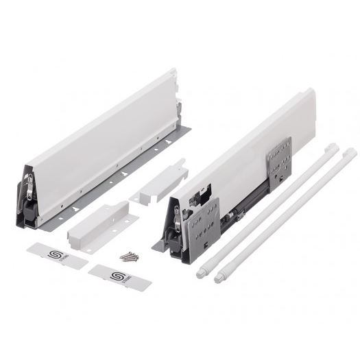Výsuv s tlmením a dutou bočnicou vrátane 1 páru relingu. Dĺžka 500mm, výška 128(140mm). Nosnosť do 35kg. Farba biela. Všetko potrebné pre zostavenie čelnej zásuvky v tejto sade.